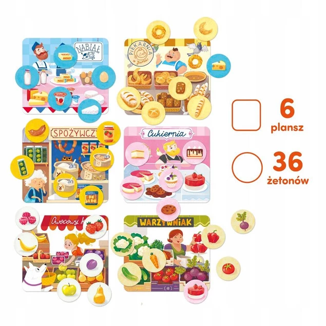 Edukacyjny zestaw zawiera 6 dużych kolorowych plansz i 36 żetonów, przedstawiających 6 różnych sklepów i smakołyki, które można w nich kupić. Do gry w loteryjkę chętnie zasiądą maluchy, starszaki i cała rodzina. CzuCzulotto sprawdzi się jako układanka, pierwsza gra dla maluchów i inspiracja do mnóstwa przeróżnych zabaw, na przykład w sklep i gotowanie. Mnóstwo pomysłów znajdziecie w poradniku, który dołączyliśmy do zestawu. Grajcie i bawcie się razem, doskonaląc przy tym przeróżne umiejętności.