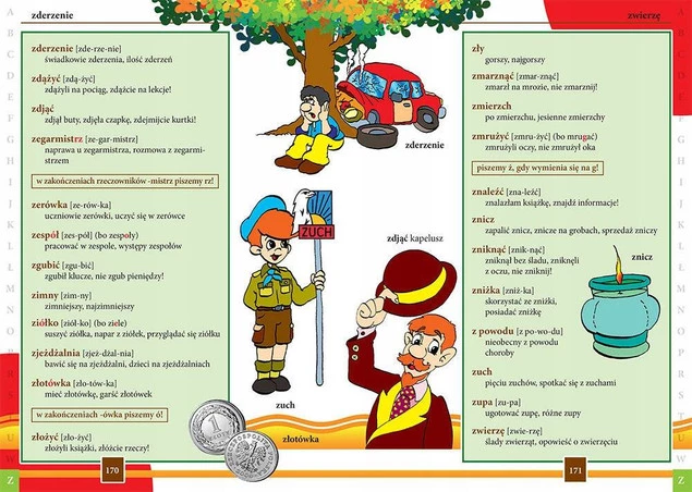 Słowniczek zawiera również podstawowe reguły ortograficzne z przydatnymi przykładami. Przejrzysty układ na stronie, wyróżnienia wyjątków, liczne wyjaśnienia odnośnie pisowni to dodatkowe atuty słownika . Opracowany przez najlepszych nauczycieli stanowi doskonałą pomoc w pierwszych latach nauki.