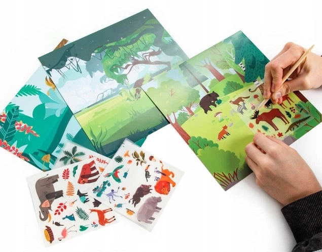 Zawiera 3 tła do wyklejania, drewnianą szpatułkę oraz 4 arkusze z motywem zwierząt.