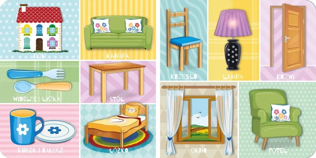 Pierwsza książeczka maluszka do nauki podstawowych słów i poznawania otaczającego świata przedstawionego na pięknych kolorowych obrazkach. Przeznaczona dla dzieci w wieku 0+, zawiera najważniejsze słowa z kategorii: dom, rodzina, zabawa, warzywa, owoce, kolory, zwierzęta, ubrania, części ciała i czynności.