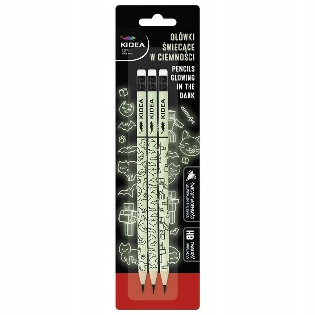 Ołówki świecące w ciemności o średniej twardości rysika HB od Kidea. Przydadzą się zarówno na lekcji matematyki, podczas rysowania, lub przy tworzeniu notatek. Różnorodne, zabawne wzory to nie jedyna wyjątkowa cecha tych niezwykłych ołówków - w ciemnym pomieszczeniu świecą one wyraźnym blaskiem!