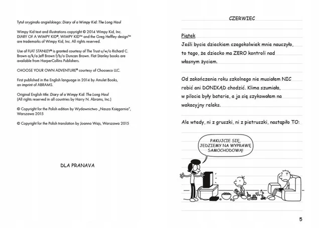 Wyprawa samochodowa z najbliższą rodziną może być świetną zabawą chyba że chodzi o rodzinę Heffleyów. Lepiej już teraz przygotujcie się na mrożącą krew w żyłach toaletę na stacji benzynowej, zwariowane mewy, ryzykowne manewry drogowe i niesforną świnię. A to dopiero początek. Jedno jest pewne - Heffleyowie przeżyją doprawdy NIEZAPOMNIANĄ przygodę (choć Greg oddałby wiele, żeby nic z niej nie zapamiętać).
