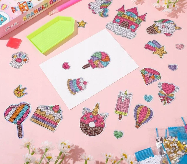 Diamentowe mozaiki to rewelacyjna zabawa dla każdego do pobudzenia kreatywności i wyobraźni oraz rozwinięcia zdolności manualnych. Aby powstał obrazek, wystarczy przykleić kolorowe diamenciki przy pomocy aplikatora, którego końcówka pokryta jest woskiem w wybrane miejsce pokryte warstwą klejącą. Każdy kolor znajdujący się na arkuszu oznaczony jest cyfrą lub literą, która odpowiada danemu rodzajowi diamencika. Kuweta, która posiada specjalne wyżłobienia, ułatwia pobieranie pojedynczego kryształka. Stworzone przez Ciebie naklejki będą piękną dekoracją zeszytu czy innego przedmiotu.