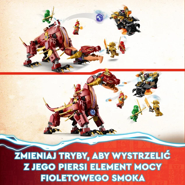 Dzięki zestawowi Lawowy smok zmieniający się w falę ognia (71793) fani ninja w wieku od ośmiu lat mogą odtwarzać swoje ulubione sceny z serialu telewizyjnego NINJAGO(R) Dragons Rising. Zawiera on niespotykanego dotąd smoka, którym dzieci mogą bawić się na dwa sposoby. W trybie pokojowym stoi majestatycznie, ale po odwróceniu do góry nogami przełącza się w tryb bojowy, który pozwala mu wystrzelić z piersi element mocy fioletowego smoka.