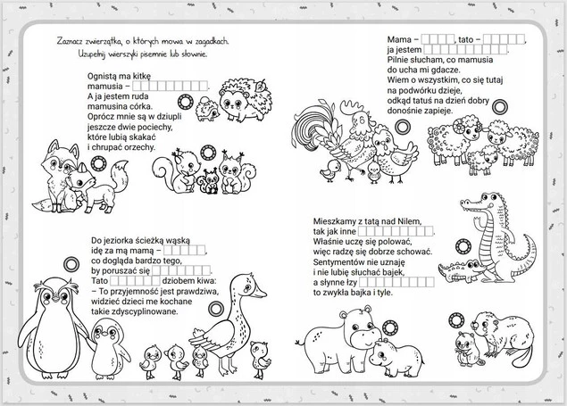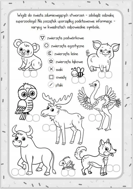 Moje zwierzęta, czyli rozrywkowy zeszyt małego ucznia Niezbędnik ciekawskiego zoologa! Wierszowane zagadki, literkowe uzupełnianki, obrazkowe dopasowywanki oraz cała gama kreatywnych zabaw rozbudzają fascynację światem zwierząt, poszerzają wiedzę oraz ćwiczą spostrzegawczość. Są doskonałą gimnastyką dla mózgu, a także świetną przygodą! Pierwsze kroki i wielkie susy w cudownym świecie nauki!