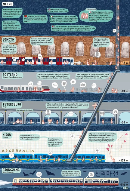 Pod ziemią, pod wodą to naładowana informacjami księga pełna ogromnych ilustracji i szczegółowych przekrojów. Poprowadzą was one w głąb naszej planety, pokazując, co kryje się pod powierzchnią lądów i wód. Będziecie schodzić coraz głębiej i głębiej od cienkiej warstwy gleby tuż pod stopami do gorącego jądra Ziemi, od skąpanych w słońcu raf koralowych do pogrążonego w ciemności i chłodzie najgłębszego miejsca oceanów.