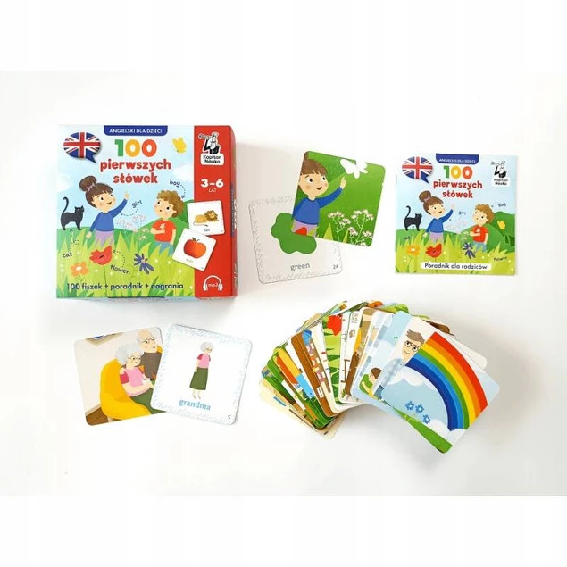 Angielski dla dzieci. 100 pierwszych słówek to zestaw 100 fiszek z podstawowymi słówkami w języku angielskim, który umożliwi dzieciom w wieku przedszkolnym łączenie zabawy z nauką języka angielskiego. Kartom towarzyszą nagrania MP3 w wykonaniu native speakera, które umożliwiają oswajanie się z prawidłową wymową od najmłodszych lat.