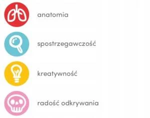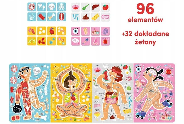 Edukacyjny zestaw to doskonały pomysł na prezent dla bystrego przedszkolaka i sposób na pierwszą lekcję anatomii na wesoło. Duża i kolorowa układanka składa się aż z 96 elementów i przedstawia schematy przeróżnych układów ludzkiego ciała: mięśniowy, kostny, pokarmowy i wydalniczy, oddechowy i krwionośny, nerwowy. Na 32 obrazkach znajdziecie wizerunki różnych narządów, które można dołożyć we właściwe miejsce na ułożonych puzzlach lub wykorzystać do innych zabaw. Do zestawu dołączyliśmy plakat pełen ciekawostek o ciele.