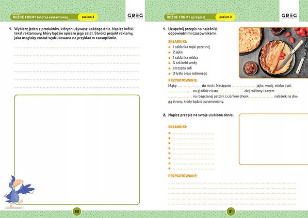 Publikacja jest przeznaczona dla uczniów klas drugich, trzecich i czwartych. Zawiera różnorodne i kreatywne zadania, dzięki którym można nauczyć się, między innymi, jak napisać poprawne ogłoszenie i zaproszenie, jak właściwie skomponować list oraz jakie elementy zawrzeć w opowiadaniu. W rozwiązywaniu zadań pomoże przedstawiona skrótowo i przystępnie teoria oraz liczne wskazówki, porady oraz zbiory przydatnych słów i fraz. Ćwiczenia są podzielone na trzy poziomy trudności.