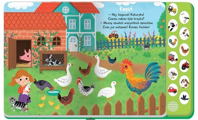 Książka dla małych miłośników zwierząt i pojazdów, a w niej bogate ilustracje oraz wierszowane historyjki. Dodatkową atrakcją są dołączone dźwięki. Posłuchaj, jak brzmią: traktor, krowa, kogut, kombajn, bocian, owca oraz inne pojazdy i zwierzęta pokazane w książce. Do czytania, słuchania i oglądania!
