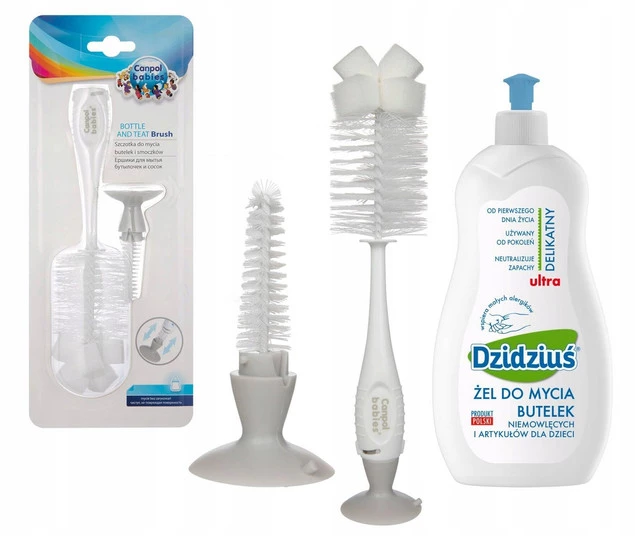 Praktyczna szczotka ułatwia mycie butelek i smoczków. Większa szczotka posiada gąbkę, która pozwala na wygodne mycie dna butelek. Mniejsza, ukryta w końcówce z przyssawką, nadaje się do czyszczenia smoczka z resztek mleka lub kaszki. Szczotka posiada specjalną przyssawkę, która umożliwia stabilne ustawienie szczotki na gładkim podłożu.