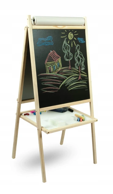 Na kreatywnego malca czeka dwustronna, rozstawiana tablica, z jednej strony tradycyjna, kredowa, a z drugiej magnetyczna, suchościeralna do pisania mazakami i ozdabiania plastikowymi literkami czy cyferkami. Jest tu także niespodzianka dla maluchów uwielbiających papierowe rysunki. Na górze stelażu umieszczono ROLKĘ PAPIERU o długości aż 15 metrów, na której powstanie wiele niezwykłych prac!