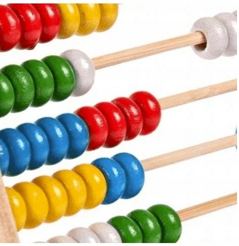Kolorowe liczydło składające się z 10-rzędów kolorowych koralików, w całości zostało wykonane z drewna.