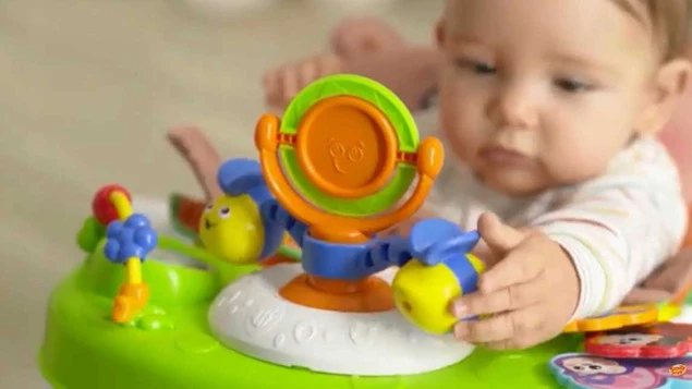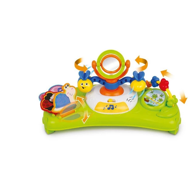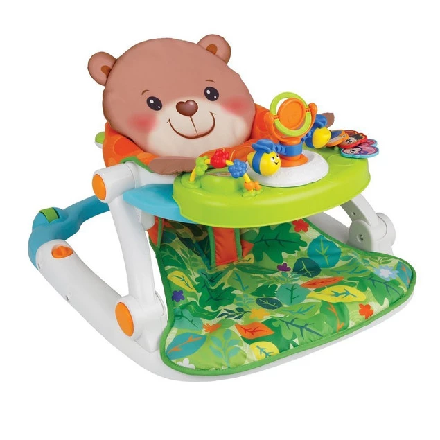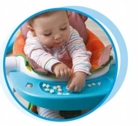 - Posiada kilka funkcji: fotel do karmienia/zabawy, chodzik-pchacz lub jeździk, odłączane Centrum Aktywności w postaci panelu z zabawkami