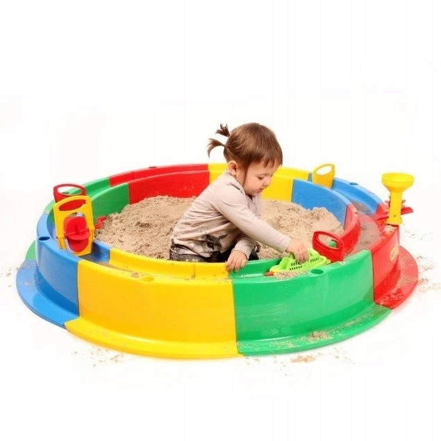 Obręcz składa się z 8 kolorowych elementów, które można łatwo i szybko złożyć w jedną całość. Brzeg piaskownicy tworzy rynnę, do której możemy nalać wody i stworzyć własny tor wodny dla zabawek! Idealne połączenie dla miłośników wody i piasku!