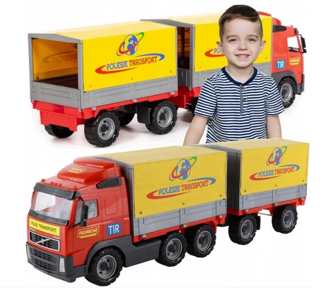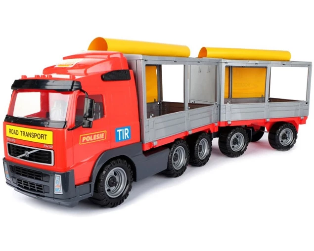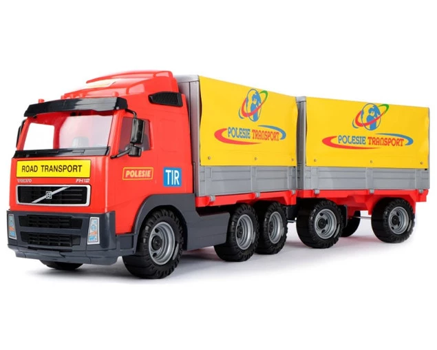 Samochód z plandeką i przyczepą VOLVO to duża ciężarówka wyposażona w szerokie koła połączone metalowymi osiami. Ich struktura nie jest gładka, co ułatwia jazdę po nierównych powierzchniach. Posiada naczepę oraz dołączoną do niej przyczepę. Na jednej i drugiej umieszczono stelaż z plandeką. Burty naczepy oraz przyczepy można otworzyć, a plandekę unieść do góry. Kabina kierowcy jest oszklona. Użyto w tym celu grubego, przezroczystego plastiku.