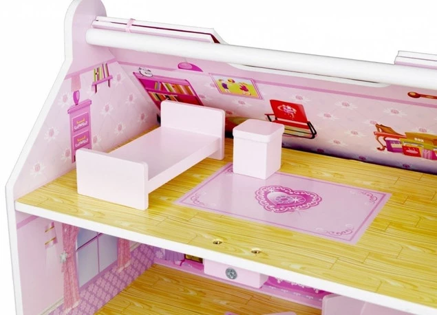 Śliczny, Duży DREWNIANY DOMEK NORIMPEX to spełnienie marzeń każdej dziewczynki. W dwupiętrowej rezydencji z poddaszem i jej gustownie urządzonych wnętrzach, zakochają się od pierwszego wejrzenia! Każdy szczegół jest tutaj precyzyjnie dopasowany i wszystko idealnie się ze sobą komponuje. Przestronne wnętrza i ich utrzymana w różowej tonacji kolorystyka spełnią wymagania najbardziej wymagającej właścicielki. Przepiękna, składająca się z trzech dużych pomieszczeń, kompleksowo umeblowana rezydencja będzie idealnym miejscem do zamieszkania przez ukochaną lalę Twojej pociechy. Gustowny budynek zachwyca dopracowanymi w najdrobniejszych szczegółach detalami i pięknymi, starannie wykonanymi mebelkami.