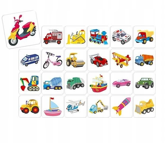 - 48 kartoników z 24 parami obrazków przedstawiających pojazdy