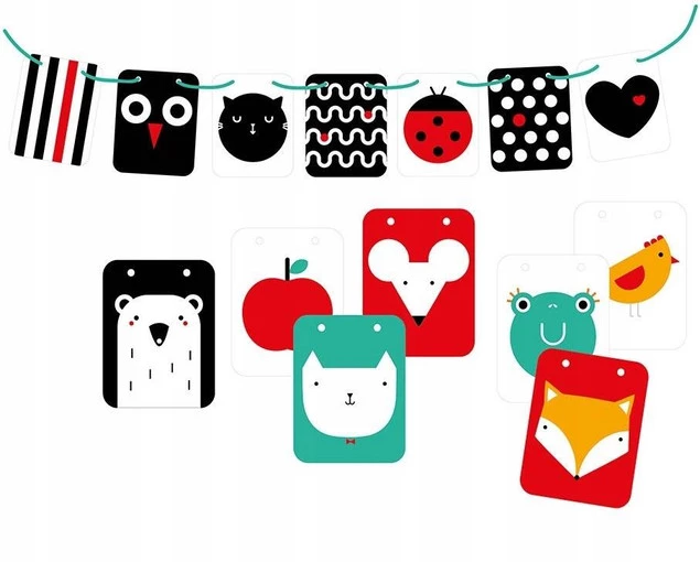 Duże dwustronne karty kontrastowe można wykorzystać jako plansze do pokazywania lub stworzyć z nich efektowną girlandę, która pomoże w ćwiczeniu wzroku malucha i stanie się wyjątkową ozdobą dziecięcego pokoju.