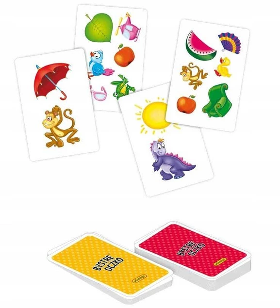 Zestaw zawiera 48 kart o wym. 11x7,4 cmoraz instrukcję z opisem pięciu wesołych gier rodzinnych. Gry zawierają elementy edukacyjne. Podczas zabawy gacze ćwiczą spostrzegawczość, pamięć i refleks.