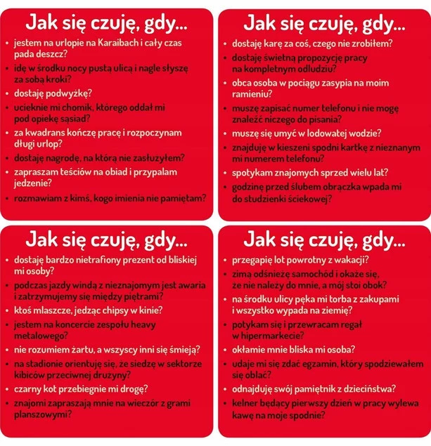 Zadajesz pytanie zaczynające się od JAK SIĘ CZUJĘ, GDY…, a pozostali gracze wykładają po jednej karcie - takiej, która według nich najlepiej pasuje do odpowiedzi na twoje pytanie. Wybierasz tę, którą uważasz za najlepiej oddającą twoje emocje. Gracz, który ją wyłożył, zdobywa punkt! Zwycięzcą zostaje osoba, która zdobędzie 3 punkty.