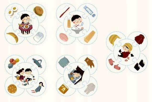 Puzzle przeznaczone dla dzieci od 2 lat. Składają się z 5 obrazków głównych oraz 20 uzupełniających. Na obrazkach głównych jest Pucio w znanych dziecku codziennych sytuacjach (np. jedzenie posiłku, poranna toaleta, ubieranie się). Elementy uzupełniające przedstawiają pojedyncze obiekty zaprezentowane także na obrazku głównym (np. kanapka, szczoteczka do zębów, czapka). Dziecko ma się przyjrzeć obrazkowi głównemu, odnaleźć pasujące do niego elementy uzupełniające i dołączyć je do obrazka głównego.