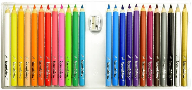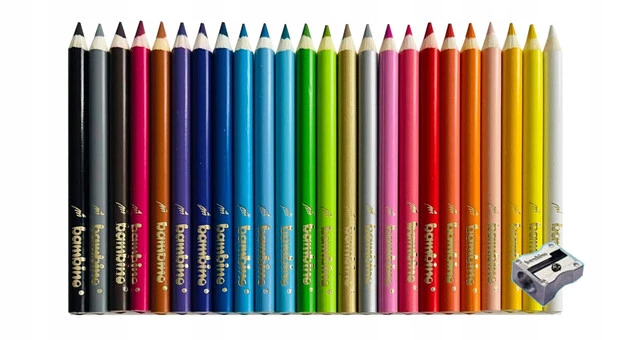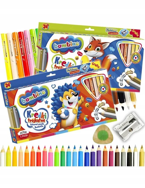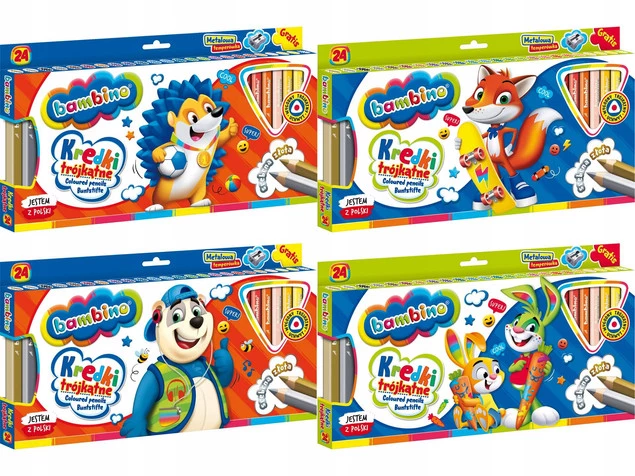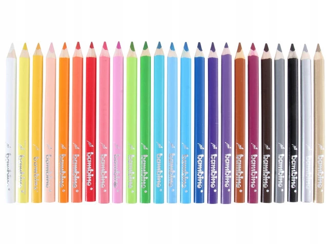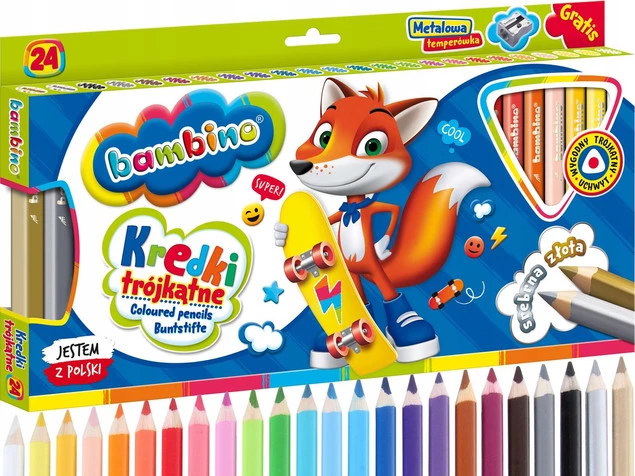 Wysokiej jakości kredki z glinki kaolinowej w drewnianej oprawie o trójkątnym przekroju. Charakteryzują się wyjątkowo intensywnymi i nasyconymi kolorami. Doskonale kryją, idealnie nadają się do rysowania, wypełniania dużych powierzchni i wykonywania miękkich przejść pomiędzy kolorami. Kredki są grube, odpowiednio wyważone, przez co idealnie dopasowują się do małej dłoni dziecka. Produkowane są w Polsce, w zgodności z dyrektywą Parlamentu Europejskiego i Rady w sprawie bezpieczeństwa zabawek oraz rozporządzeniem Ministerstwa Gospodarki w sprawie zasadniczych wymagań dla zabawek, co gwarantuje bezpieczeństwo kredek Bambino.