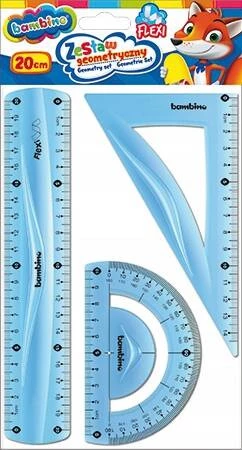 Zestaw przydatny w szkole, w szczególności na zajęciach matematycznych. W skład zestawu wchodzą: linijka, ekierka, kątomierz. Produkty zostały wykonane ze specjalnego materiału odpornego na złamanie.