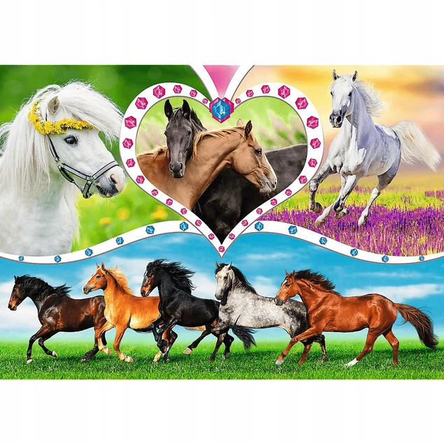 Piękne konie to puzzle składające się z 200 elementów przedstawiające kolaż z uroczymi końmi. Po ułożeniu powstanie obrazek o wymiarach 480x340 mm.