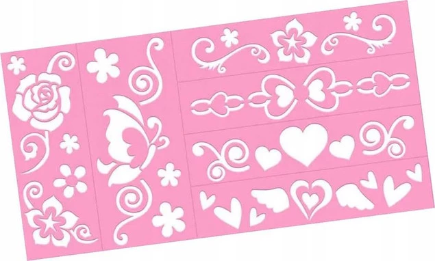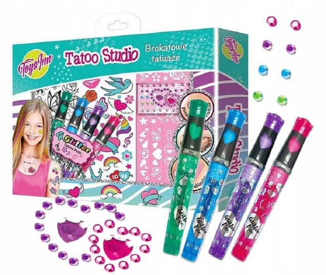Do wykorzystania są brokatowe tatuaże, szablony, jednobarwne tatuaże, które można pokolorować dołączonymi brokatowymi markerami.