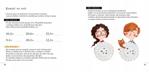 Specjalna konstrukcja i forma książki pomagają skupić się na konkretnym zagadnieniu. Całość jest podzielona na 5 części: dodawanie, odejmowanie, mnożenie, dzielenie i różności matematyczne, w których dziecko oswaja się z ułamkami, odczytywaniem godziny na zegarze, a także szacowaniem długości.