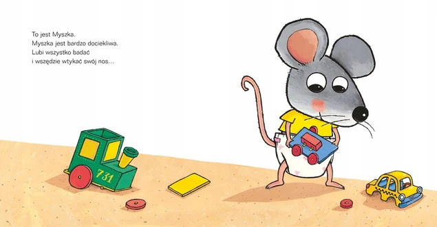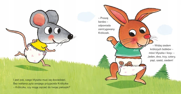 Czytając tę zabawną historyjkę, razem z Myszką zaglądajcie do pieluszek Króliczka, Kózki, Pieska, Krówki, Konika i Świnki. Nauka korzystania z nocniczka może być świetną zabawą! Książka zachęca też do pierwszych prób samodzielnego liczenia oraz uczy rozpoznawania różnych zwierząt.