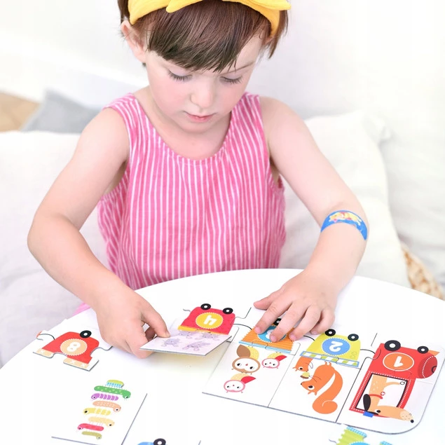 Aby długi i kolorowy pociąg wyruszył ze stacji, ułóżcie wagony we właściwej kolejności i dopasujcie odpowiednią liczbę pasażerów i towarów. Układajcie puzzle, poznając przy tym cyfry i uczcie się liczyć do 10. Puzzle to doskonały pomysł na prezent dla ciekawego świata przedszkolaka. Dzieci potwierdzają: liczenie to świetna zabawa!