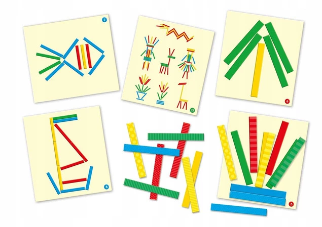 - 40 tekturowych patyczków w czterech kolorach: żółtym, czerwonym, zielonym, niebieskim