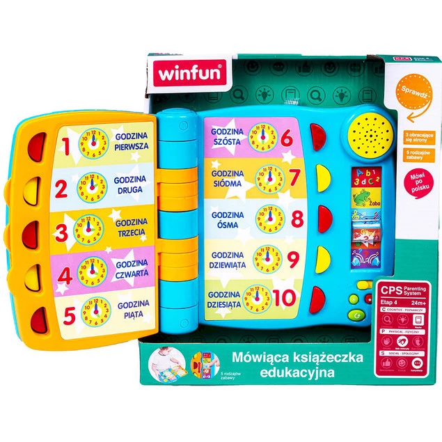 Książeczka Edukacyjna zainspiruje do poznawania liter cyfr wyrazów kształtów odgłosów i godzin. Dzieci przerzucając kolejne strony mogą naciskać guziki decydując jakie nowe słowa chcą poznać. Pięć różnych trybów zabawy oraz przyjazna grafika zachęci do zdobywania nowej wiedzy oraz utrwalania wiadomości. Zabawka pozwala dziecku zdecydować o intensywności i rodzaju zabawy zgodnym z wiekiem oraz zainteresowaniami malucha.