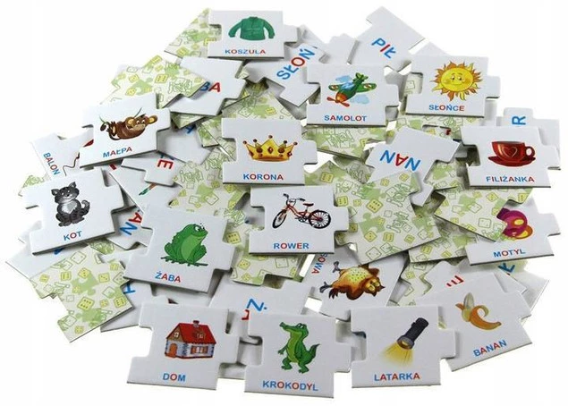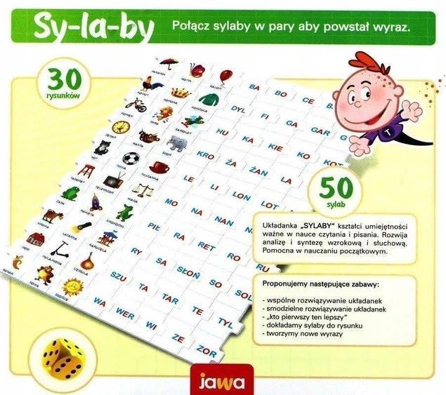 Warto zadbać o to, żeby jak najszybciej zacząć kształcić najmłodszych. Ta układanka dla dzieci w wieku od 6 do 8 lat jest doskonałą pomocą. Skupia się na umiejętnościach związanych z czytaniem i pisaniem. W opakowaniu znajduje się 30 puzzli z obrazkami i 50 puzzli z sylabami. Zadaniem dziecka jest łączyć odpowiednie sylaby, z których powstanie wyraz - jest on nazwą tego, co znajduje się na ilustracji. Podczas takiej zabawy pociecha utrwala i poszerza wiedzę związaną z czytaniem i pisaniem. Zaletą układanki jest to, że łączy ona zabawę z nauką. Dzięki temu dziecko chętnie po nią sięgnie, ponieważ taka forma edukacji jest atrakcyjna dla młodej osoby.