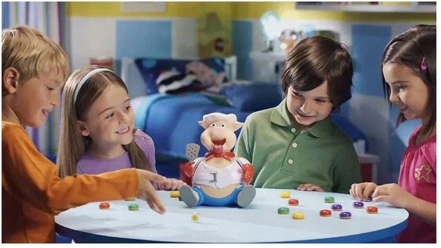 - Gra zręcznościowa Piggy Pop „Nie pękaj, Prosiaczku!” marki Goliath dla dzieci 4+. Karm prosiaczka hamburgerami, obserwuj jak rośnie mu brzuszek i sprawdź, komu pierwszy pęknie fartuszek – wesoła gra rodzinna dla 2–6 graczy, do 30 minut.