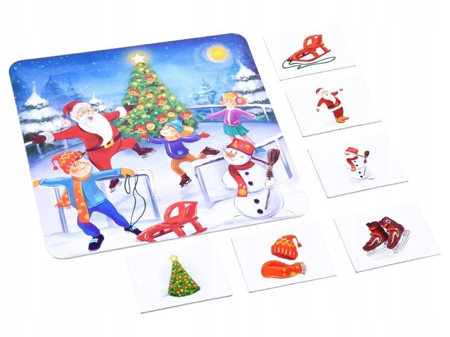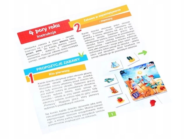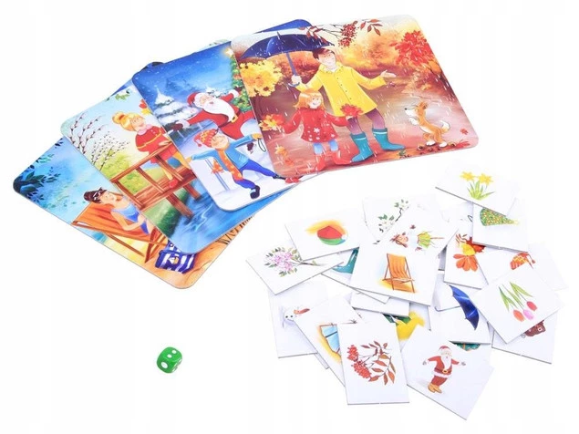 Cztery pory roku. Układanka dla dzieci w wieku 4-6 lat. Zawiera 4 plansze i scenki związane z porami roku. Zadaniem graczy jest odnalezienie 6-ciu żetonów z obrazkami, które kojarzą się z wylosowaną scenką przedstawioną na planszy. Zwycięża gracz, który pierwszy odnajdzie 6 odpowiednich żetonów.