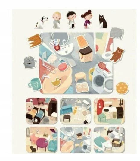 W pudełku znajduje się 6 plansz z różnymi pomieszczeniami w mieszkaniu należącym do rodziny naszego bohatera. Do każdego z nich dopasowano po 6 żetonów z przedmiotami charakterystycznymi dla tych pomieszczeń. Dziecko układa przedmioty w odpowiednich miejscach na planszach (np. na stoliku w salonie, pod krzesłem w kuchni, w pudełku) według załączonej instrukcji lub poleceń wymyślonych przez rodzica. Uczy się przy tym rozumienia stosunków przestrzennych, czyli położenia przedmiotów względem siebie.