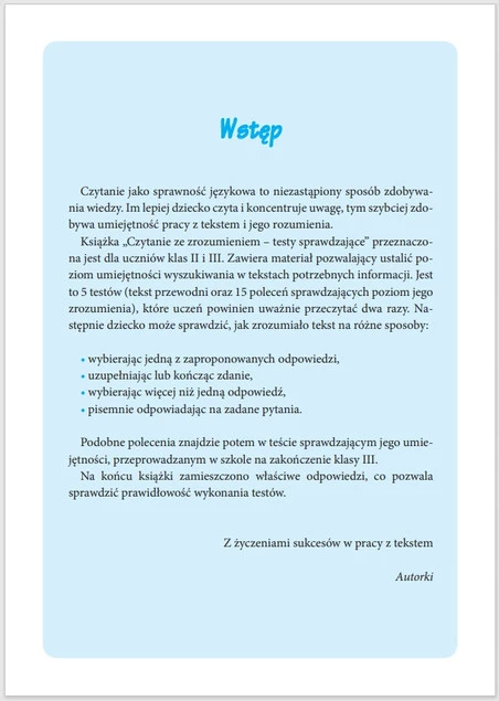 Po raz pierwszy poziom jej opanowania sprawdzany jest już u uczniów kończących klasę trzecią. Na zakończenie pierwszego etapu edukacyjnego dzieci przystępują do sprawdzianu kompetencji, tzw. trzecioteściku. Jego celem jest dostarczenie informacji na temat poziomu wiadomości i umiejętności, które uczniowie zdobyli w ciągu pierwszych trzech lat nauki. Dobrze opanowana umiejętność czytania ze zrozumieniem, którą sprawdzają i rozwijają prezentowane testy, pomaga małemu uczniowi osiągnąć sukces i zapewnić powodzenie nie tylko podczas pierwszego poważnego sprawdzianu, ale i w dalszej karierze szkolnej.