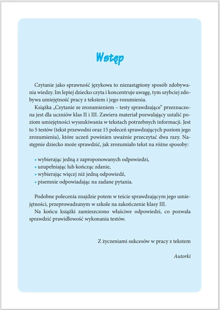 Dobrze opanowana umiejętność czytania ze zrozumieniem, którą sprawdzają i rozwijają prezentowane testy, pomaga małemu uczniowi osiągnąć sukces i zapewnić powodzenie nie tylko podczas pierwszego poważnego sprawdzianu, ale i w dalszej karierze szkolnej.