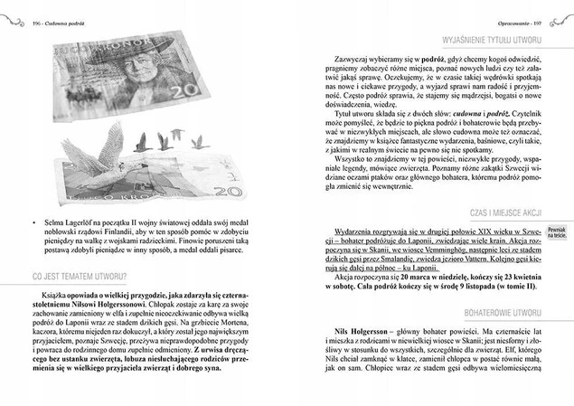 Wydanie Cudownej podróży kompletne bez skrótów i cięć w treści. W tym wydaniu znajdziesz odpowiedzi na pytania z podręcznika - „pewniak na teście”, czyli wskazanie zagadnień, które zwykle pojawiają się w pytaniach z danej lektury we wszelkich testach sprawdzających wiedzę, a także w podręcznikach i na klasówkach. Książka zawiera pełen tekst lektury. Na końcu książki zamieszczono opracowanie, w którym znajduje się bardzo szczegółowe streszczenie oraz drugie skrócone, ułatwiające szybkie przygotowanie się przed lekcją. Opracowanie zawiera ponadto plan wydarzeń, wnikliwie wyjaśnioną problematykę oraz szerokie charakterystyki bohaterów.