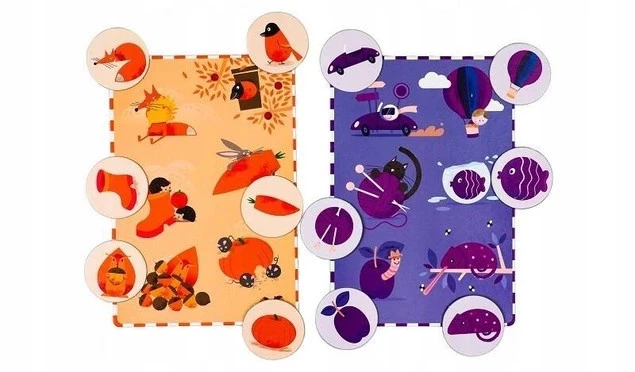 6 bajecznie kolorowych plansz oraz 36 okrągłych żetonów to propozycja idealnej zabawy dla najmłodszych dzieci. Cztery warianty rodzinnej rozgrywki zachęcą do gry również starsze dzieci i będą okazją do doskonalenia umiejętności porządkowania i grupowania obiektów na żetonach, a także rozwijania pamięci wzrokowej.