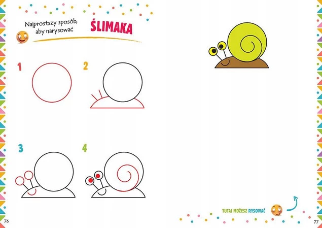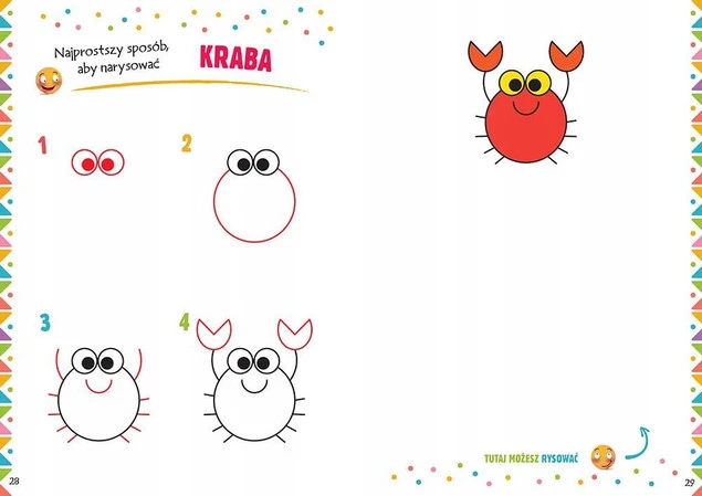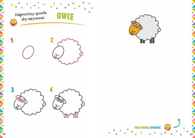 Sposób narysowania danej ilustracji przedstawiony jest po kolei w czterech najprostszych krokach. W każdym z kolejnych etapów rysowania zostały wyraźnie zaznaczone nowe elementy do dorysowania. Dzięki temu każde dziecko samodzielnie będzie w stanie narysować samochód, kotka, lalkę, motocykl czy tygrysa!