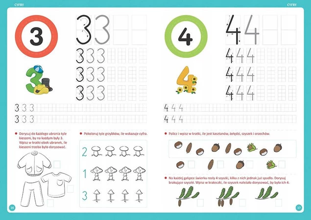 ✔ Publikacja skupia się na podstawach matematyki, wprowadza w nie malucha krok po kroku, wychodząc od zadań przypominających bardziej zabawę, przechodzi do nauki cyferek, podstawowych działań i prostych zadań tekstowych.