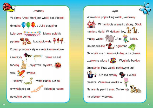 ✔Mój pierwszy elementarz... prezentuje literki, sylaby, wyrazy i zdania - na przestrzeni książki stopniowo wzrasta poziom trudności, co jest zgodne z naturalną logiką nauki czytania. Dzięki temu dzieci rozwijają i utrwalają swoje umiejętności. Oprócz krótkich czytanek książka pełna jest wesołych obrazków z podpisami - na tych pojedynczych słowach dzieci mogą dodatkowo poćwiczyć nowe zdolności. Kończy ją kilka obszerniejszych czytanek, które zachęcają dziecko poprzez swój wesoły wygląd - część słów zastąpiono w nich obrazkami, dlatego czytając, dziecko rozwiązuje jednocześnie rysunkowe zagadki. Jednym słowem, z Elementarzem... nie sposób się nudzić!