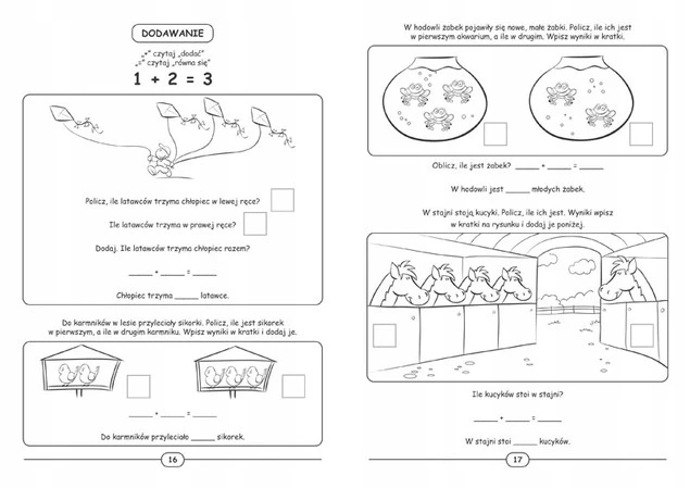 ✔W książeczce zostały też zaprezentowane podstawy dodawania i odejmowania. Dodatkowym atutem książki są wesołe, kolorowe naklejki wielokrotnego użytku.