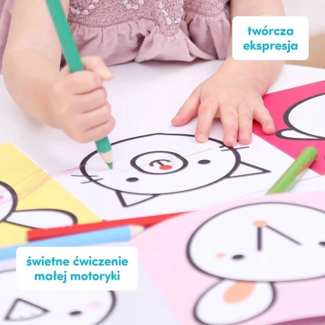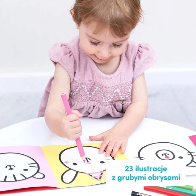 W kreatywnym zestawie znajdziecie 2 długie książeczki harmonijki, które zawierają proste ilustracje z grubymi konturami. Tematyka i urocze obrazki zachęcają maluchy do sięgania po kredki i podjęcia pierwszych prób rysowania. Maluchy potwierdzają: kreatywny zestaw to doskonały pomysł na pierwsze kolorowanki.