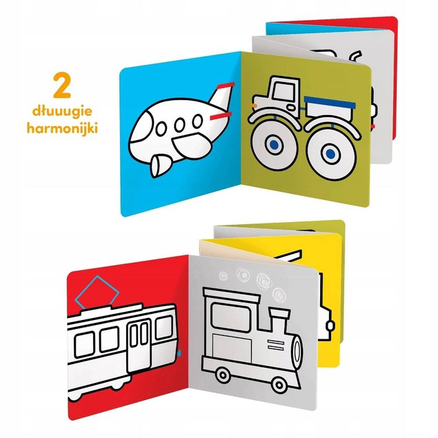 W kreatywnym zestawie znajdziecie 2 długie książeczki harmonijki, a w nich kolorowe pojazdy. Urocze ilustracje, dostosowane do wieku początkujących artystów, mają grube kontury. Lubiana przez najmłodszych tematyka zachęca dzieci do kolorowania i rysowania. Maluchy potwierdzają: ten zestaw doskonale sprawdza się jako pierwsze kolorowanki.