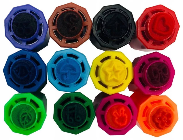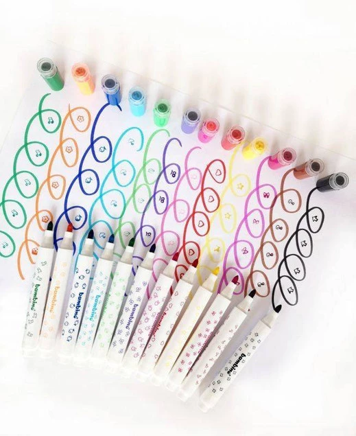 W zestawie znajduje się 12 flamastrów, każdy z innym wzorem stempelka, takim jak nutka, kwiatek, serduszko czy gwiazdka, które rozwijają wyobraźnię i zdolności manualne dziecka podczas zabawy.